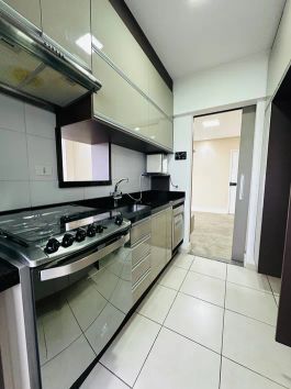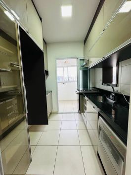 A cozinha é completa, repleta de armários planejados e equipada com fogão, depurador, lava-louças e filtro de água, oferecendo funcionalidade e conforto. Possui aquecedor a gás. A sala é ampla e integrada à varanda, que também conta com armários, ideal para momentos de lazer e organização.