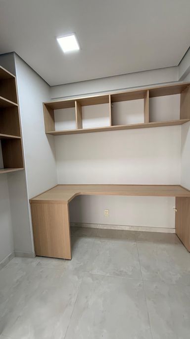 O living é espaçoso e integrado, ideal para receber convidados, além de contar com um espaço dedicado para home office. A cozinha americana possui móveis planejados, proporcionando funcionalidade e modernidade ao ambiente.