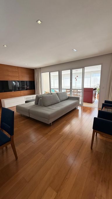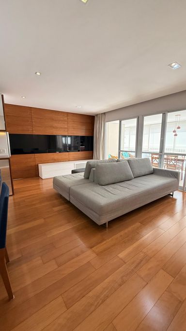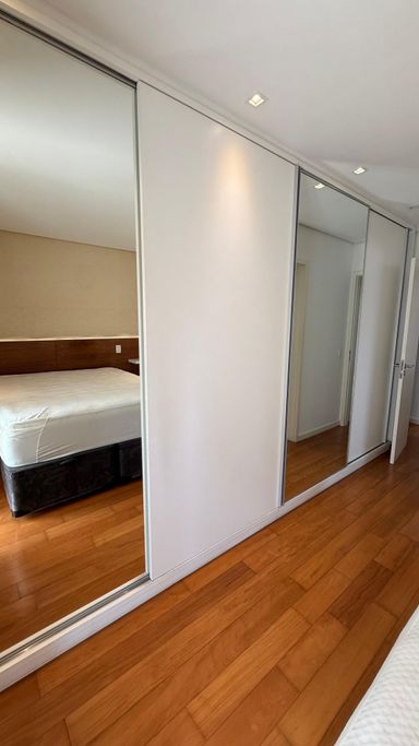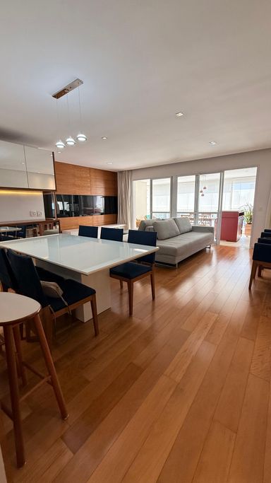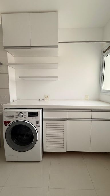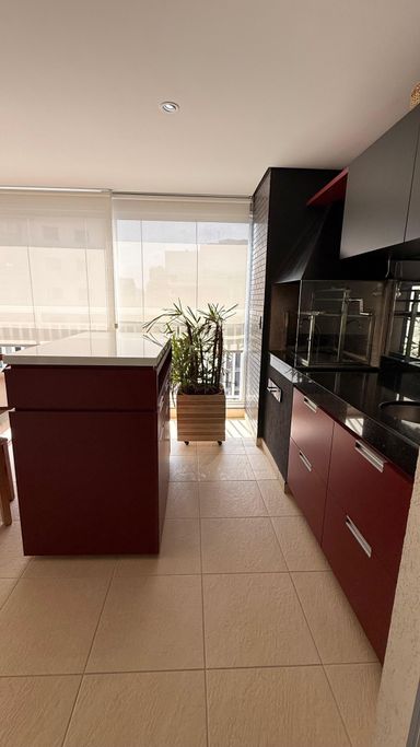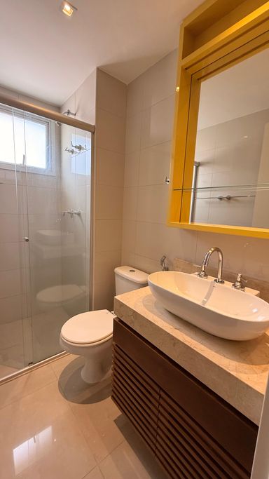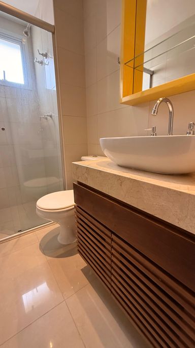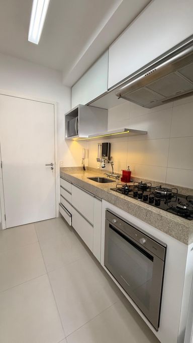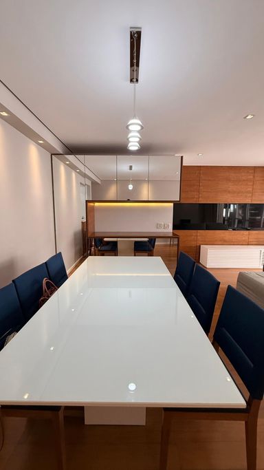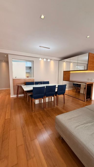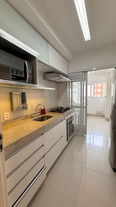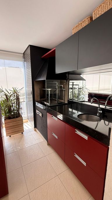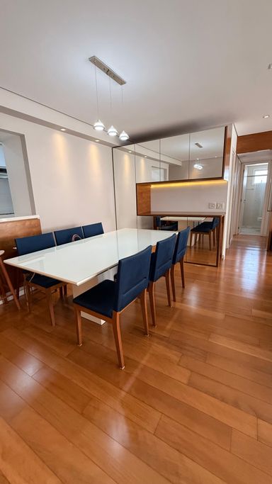 Apartamento com 2 quartos, sendo 1 suíte, lavabo e banheiro social. Possui sacada com churrasqueira e 2 vagas de garagem.