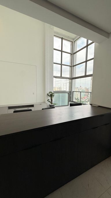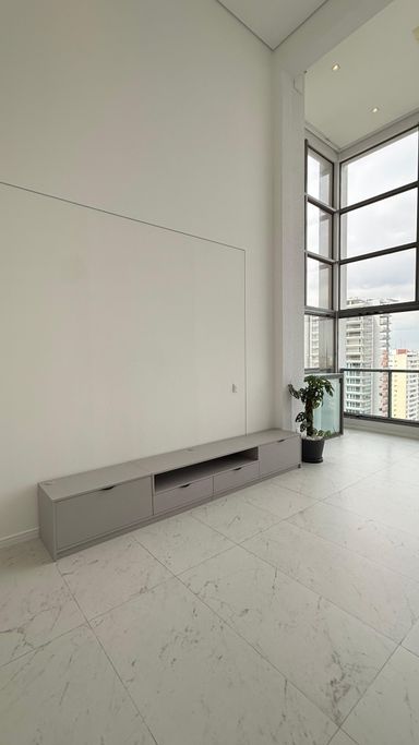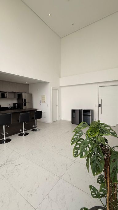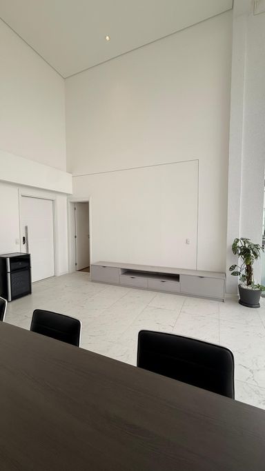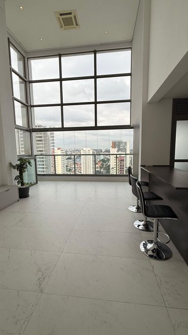 Sala com pé-direito alto, excelente iluminação natural e uma vista incrível.