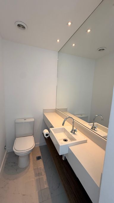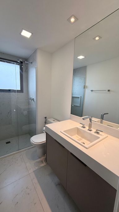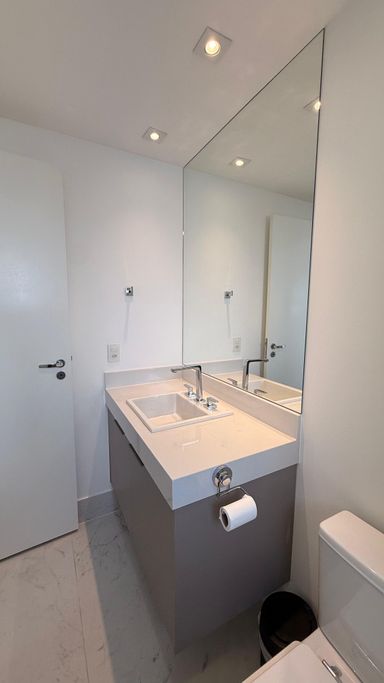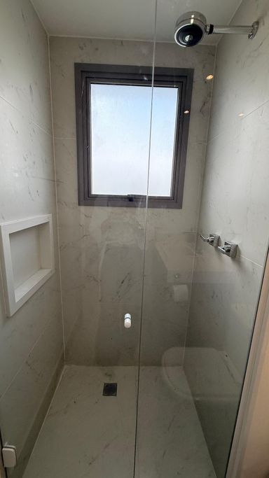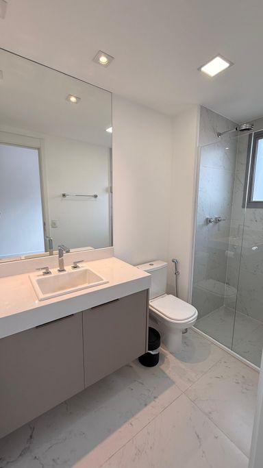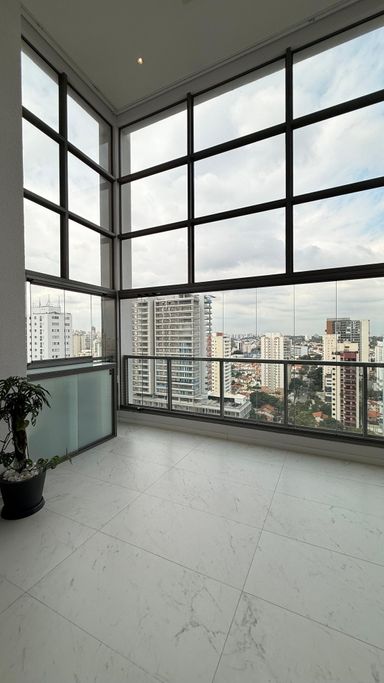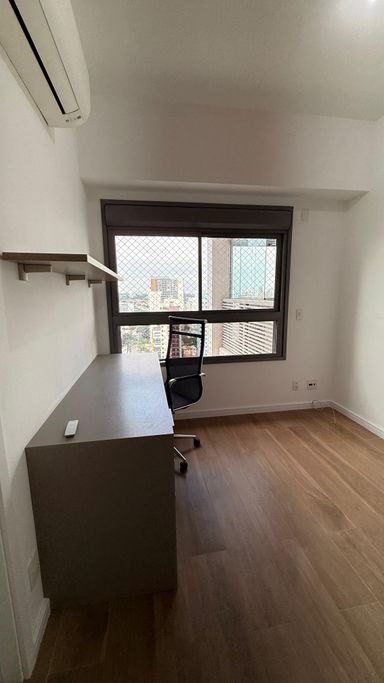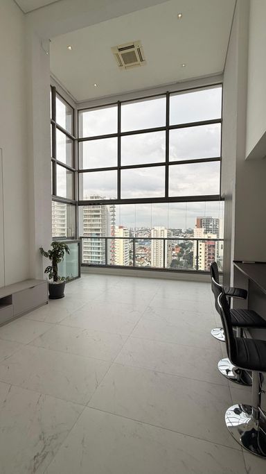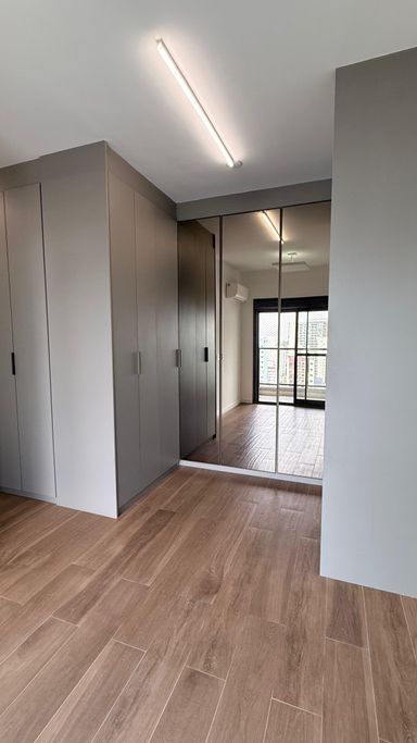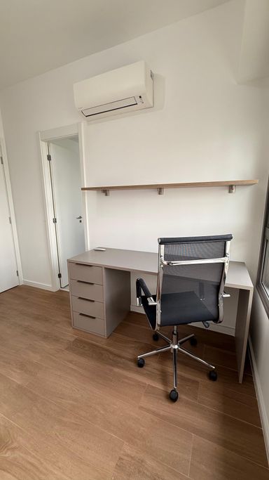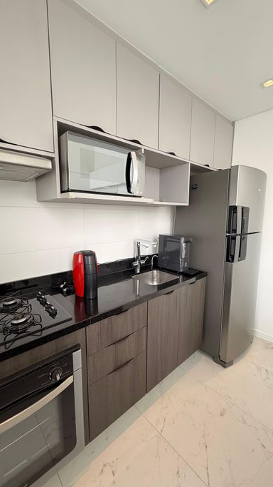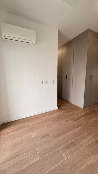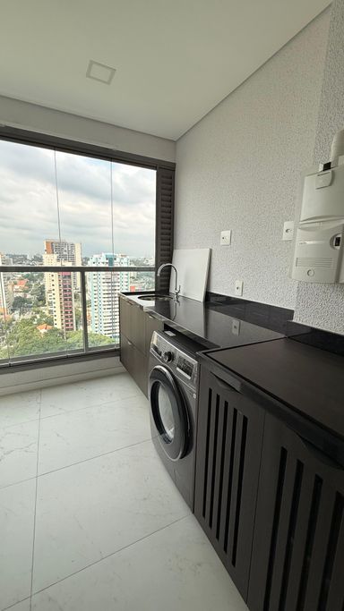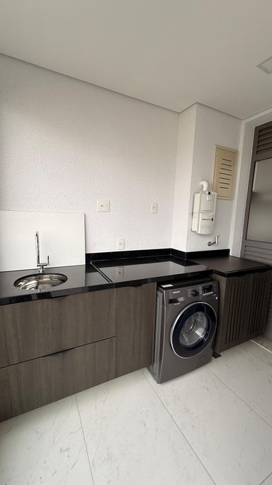 O apartamento conta também com ar-condicionado, aspirador central, armários planejados e máquina lava e seca.