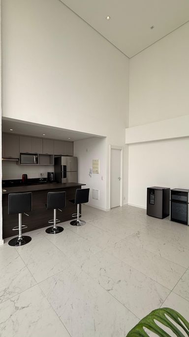 Cozinha americana equipada com adega, cervejeira, micro-ondas, geladeira e cafeteira.