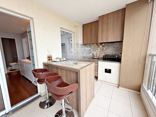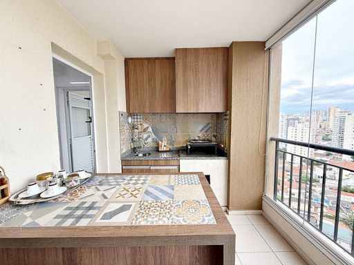 - Varanda gourmet com churrasqueira a carvão, fechamento em vidro Blindex, andar alto e sol da manhã