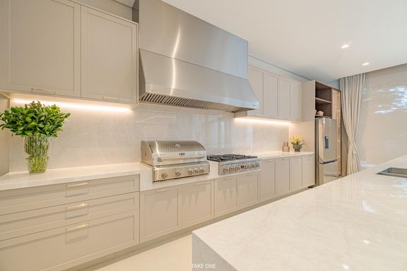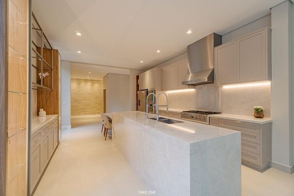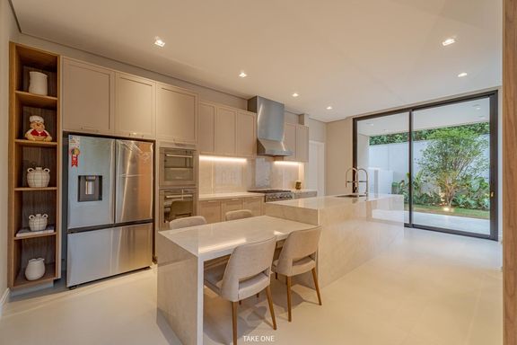 A cozinha e o espaço gourmet são integrados à área externa e executados com mobiliário Breton, marcenaria Florence e bancadas em pedra natural mármore Taj Mahal, tanto na cozinha quanto no espaço gourmet.