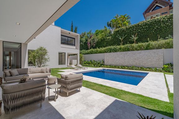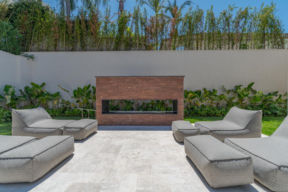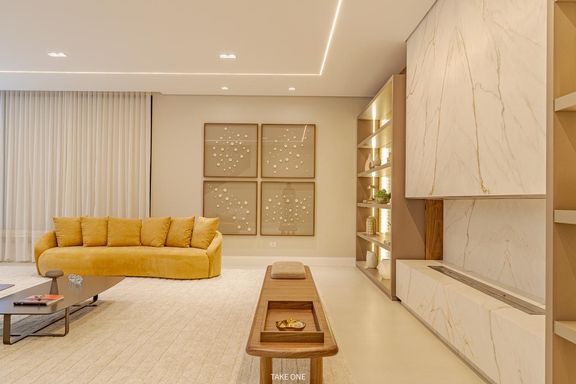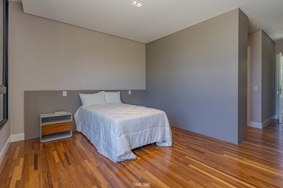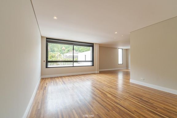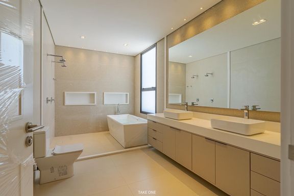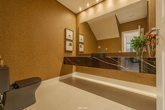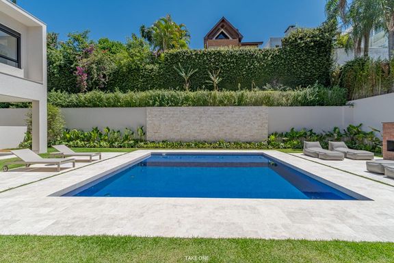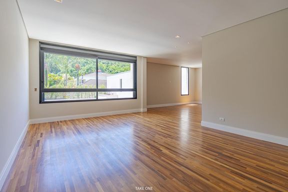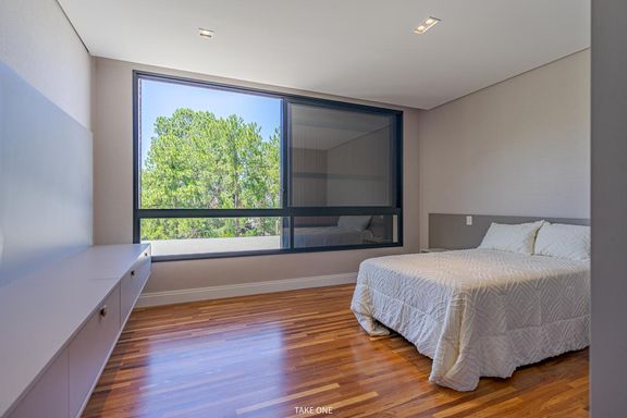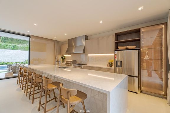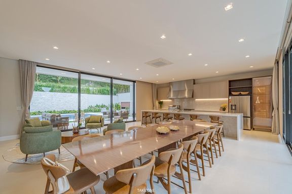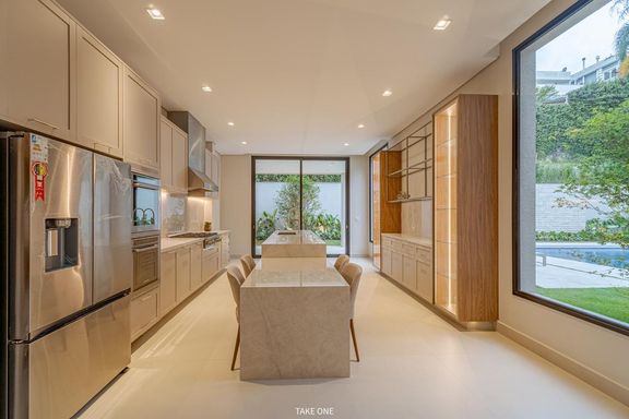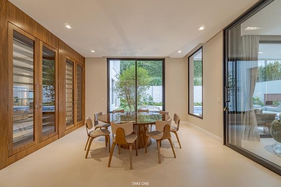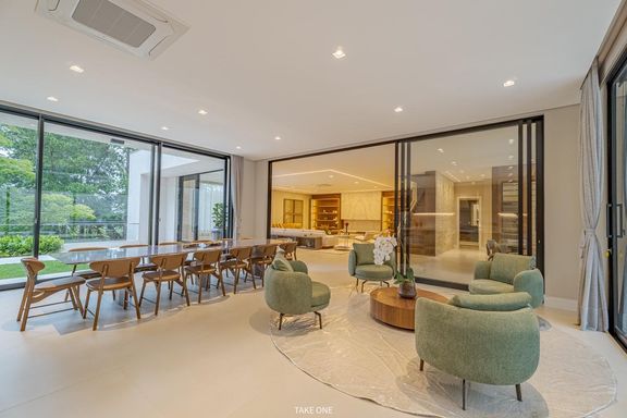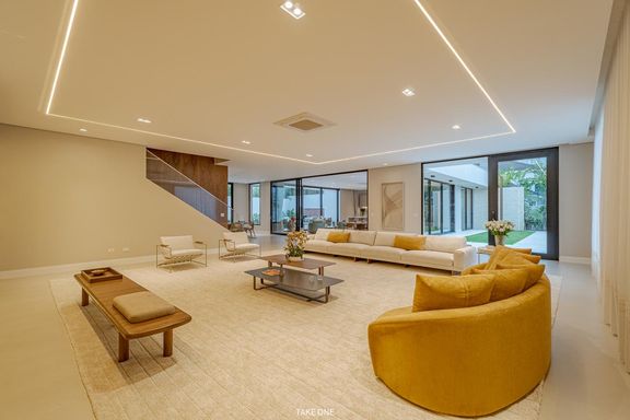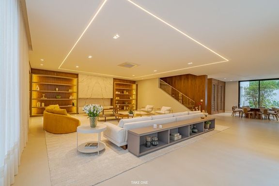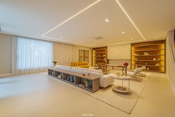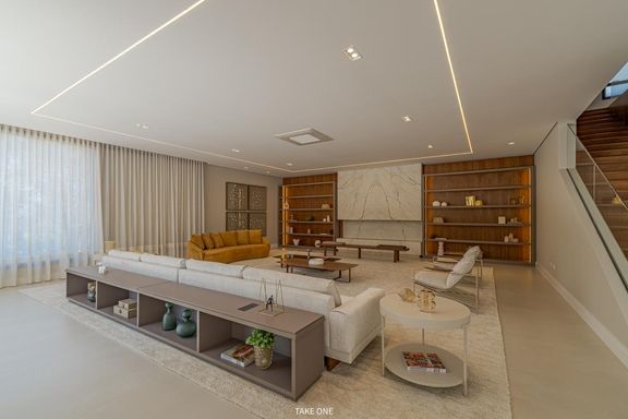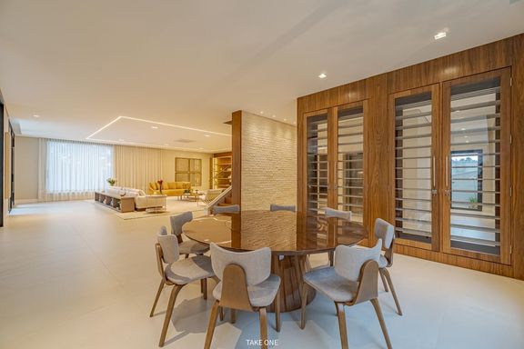 Os ambientes sociais são amplos e integrados, com living de aproximadamente 100 m² e excelente iluminação natural. A residência conta ainda com home theater equipado com telão de 150 polegadas e adega com capacidade para aproximadamente 200 garrafas.