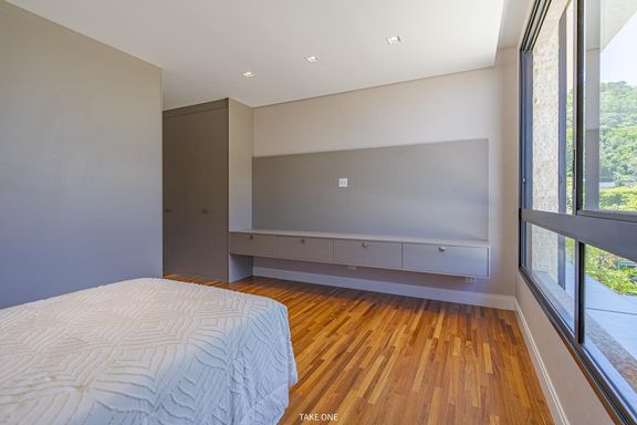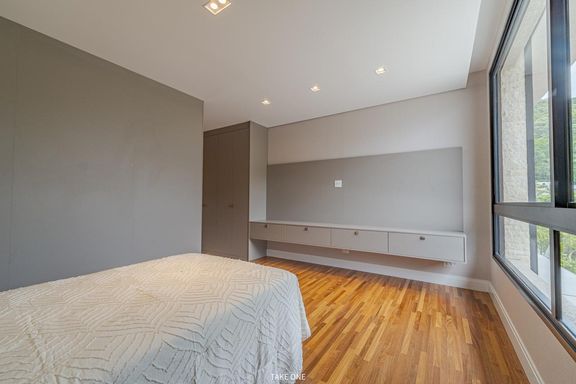 O imóvel está implantado em um lote de 1.280 m², com área construída de 1.030 m². Possui cinco suítes completas com móveis planejados, incluindo uma suíte master com amplo closet, banheiros independentes para senhor e senhora e vista permanente para área verde.