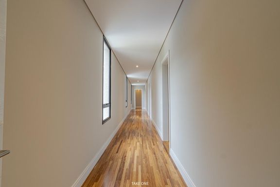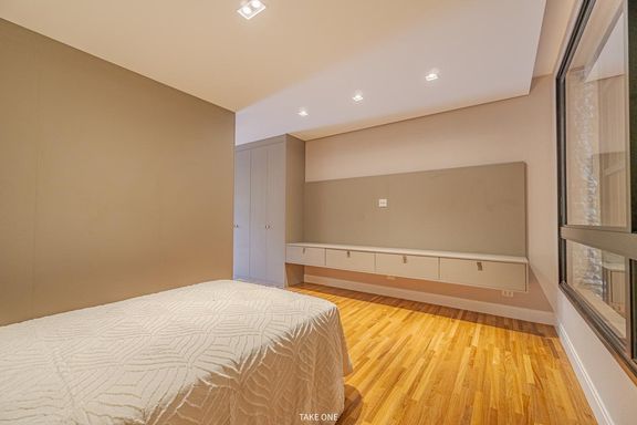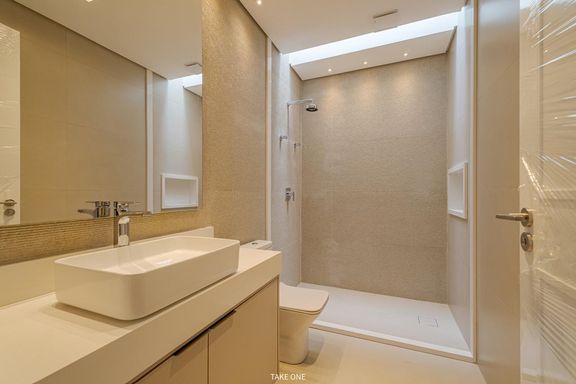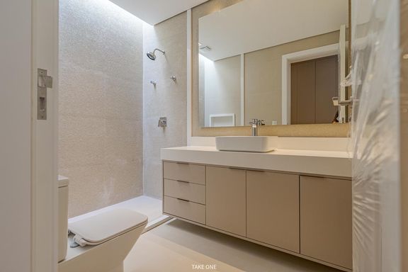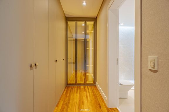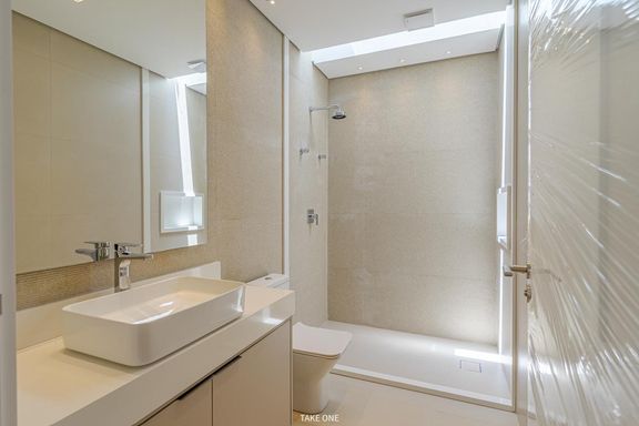 O imóvel dispõe de elevador com capacidade para seis pessoas, sistema de automação, sistema de aspiração central, energia fotovoltaica, aquecimento solar com boiler de 600 litros, ar-condicionado instalado em todos os ambientes e infraestrutura para carregamento de veículo elétrico.